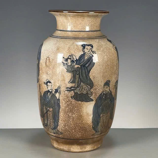 bình gốm sứ có men rạn với các hình vẽ nhân vật màu xanh lam nhạt dưới men, có thể là gốm sứ cổ Trung Quốc hoặc Việt Nam.