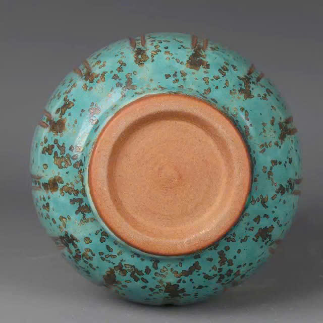 - Hiệu ứng hỏa biến/men sủi: Bề mặt men nổi bật với hiệu ứng “hỏa biến” hoặc men “sủi” (speckled glaze), tạo nên các đốm nhỏ màu nâu đồng hoặc vàng nhạt rải rác khắp thân bình. Các vết loang màu nâu chảy xuống phần dưới của thân bình tạo thành các vệt dài (streaks), đặc biệt rõ nét ở khu vực quanh vai bình, tăng thêm chiều sâu và vẻ đẹp tự nhiên, độc đáo cho tác phẩm.