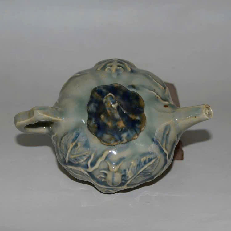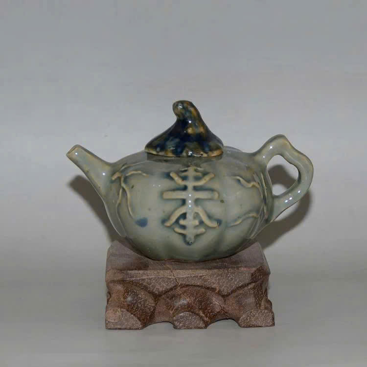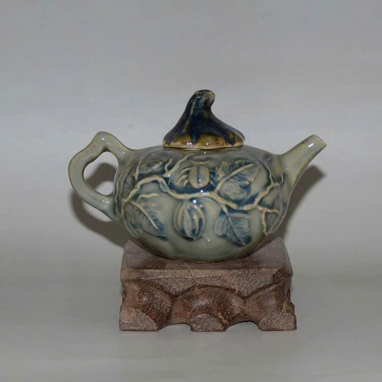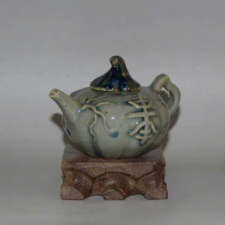 Chiếc ấm trong ảnh là ấm gốm men xanh ngọc cổ, có tạo hình rất đặc sắc và mang đậm phong cách thủ công truyền thống.