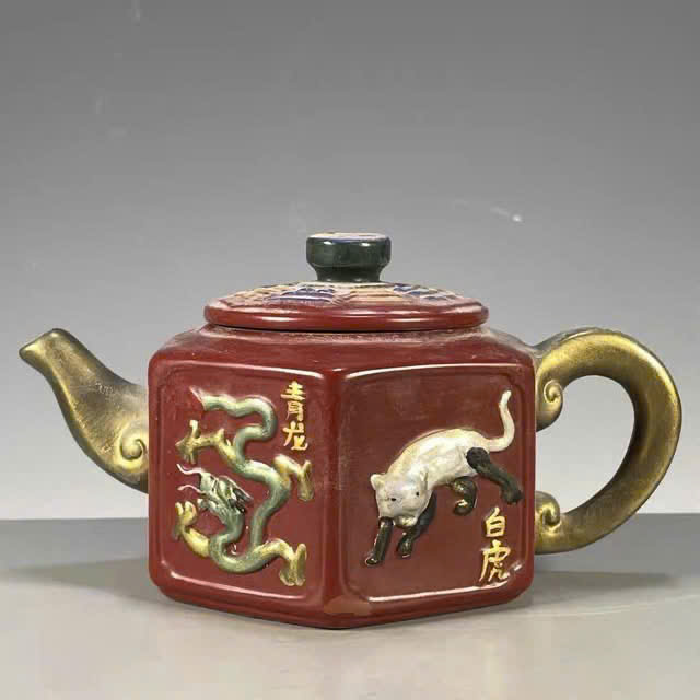Đây là một chiếc ấm trà gốm sứ hình vuông với họa tiết chạm khắc nổi hình rồng xanh và hổ trắng trên nền men đỏ đậm.