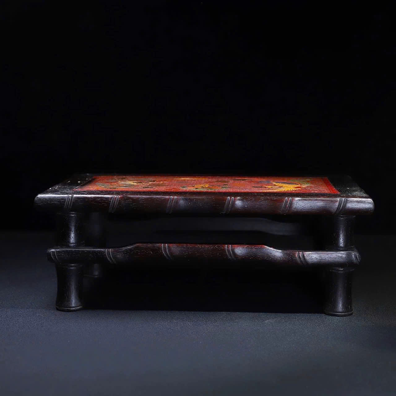 Đặc điểm: Bàn có phần mặt được khảm (inlaid) các họa tiết rồng và phượng hoàng bằng sơn mài hoặc khảm trai trên nền màu đỏ, với phần khung và chân bàn được chạm khắc thủ công tinh xảo. Phong cách: Đồ cổ Trung Quốc, thường mang phong cách cổ điển hoặc tân cổ điển, với các biểu tượng rồng và phượng hoàng tượng trưng cho sự may mắn và quyền lực.