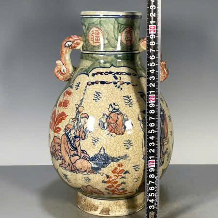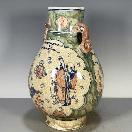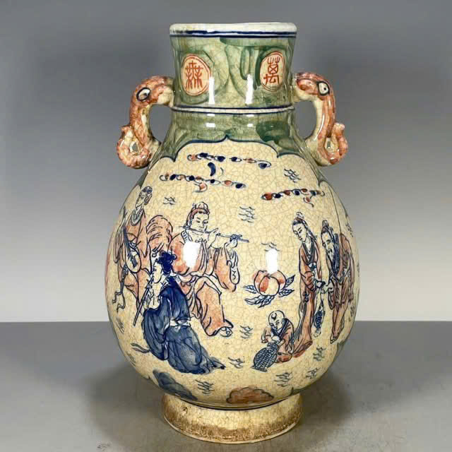 - Phong cách: Bình mang phong cách gốm sứ đời Thanh (Qing dynasty), đặc biệt là kiểu men rạn Nam Kinh (Nanjing crackle) hoặc gốm sứ vẽ men nhiều màu (polychrome enamel).