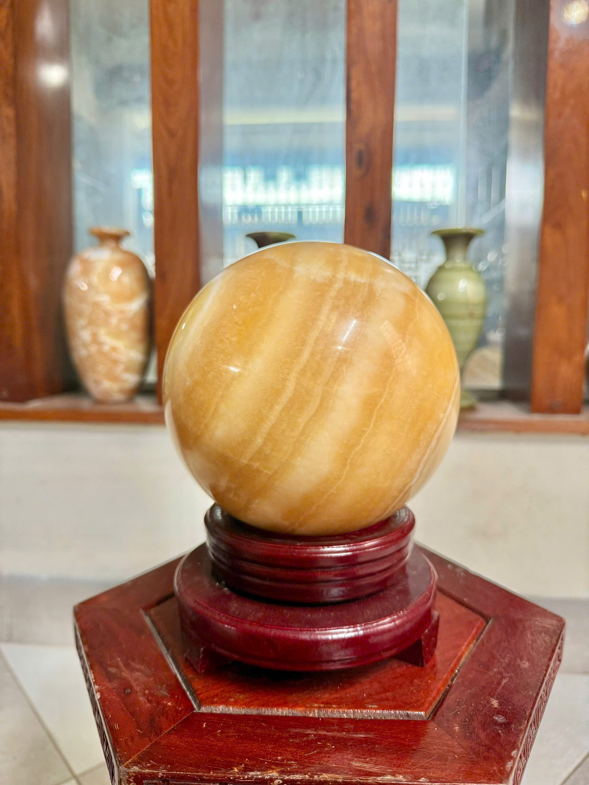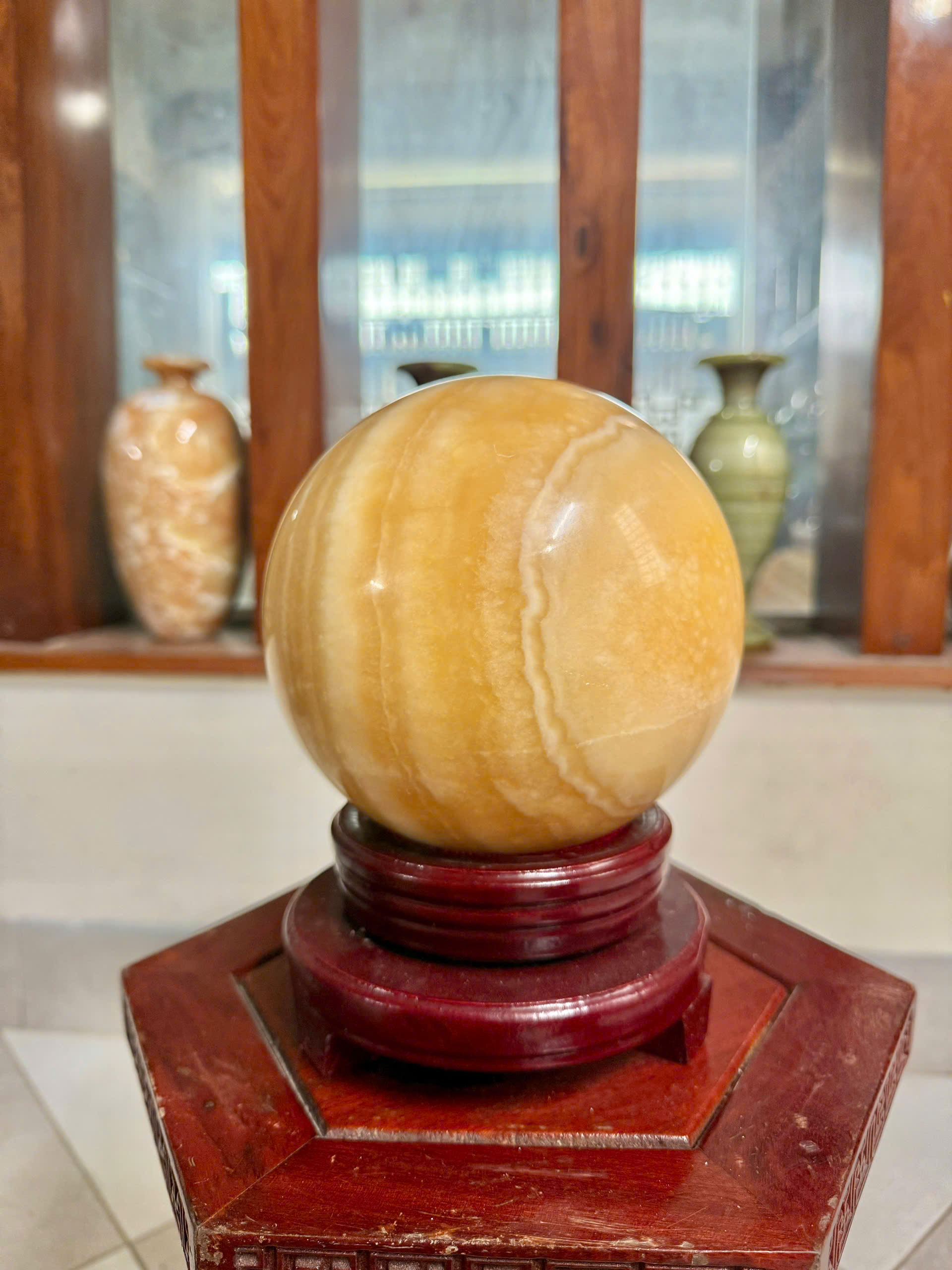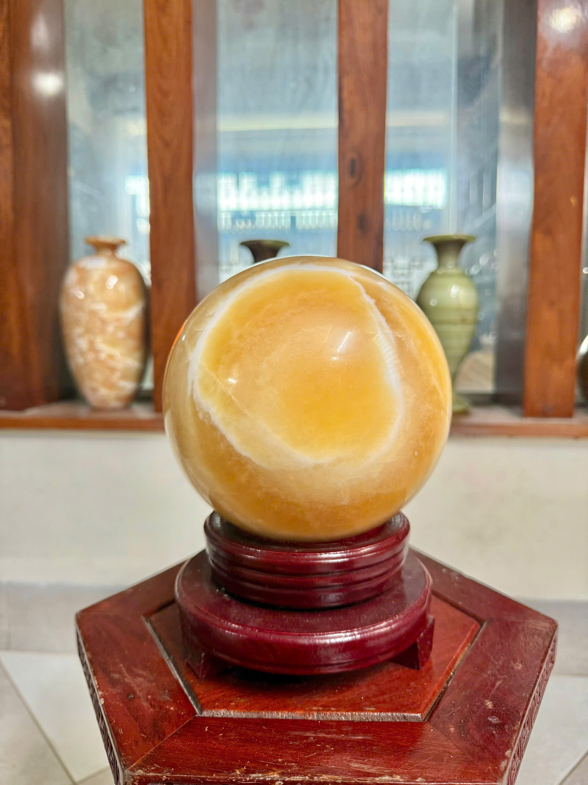 Biểu tượng của sự viên mãn: Hình dạng cầu tròn tượng trưng cho sự trọn vẹn, hoàn hảo và thuận lợi trong cuộc sống cũng như công việc. Chiêu tài hút lộc: Đá ngọc hoàng long (canxit vàng) được xem là vật phẩm phong thủy số một trong việc thu hút tài lộc, mang lại vượng khí và thành đạt cho gia chủ, đặc biệt tốt cho người làm kinh doanh. Tăng cường sự tập trung: Đặt quả cầu đá này trên bàn làm việc hoặc trong phòng khách có thể giúp tăng cường sự tập trung, giảm căng thẳng và cải thiện trí nhớ. Hợp mệnh: Loại đá này mang ngũ hành thuộc Thổ, nên rất hợp với người mệnh Thổ hoặc mệnh Kim