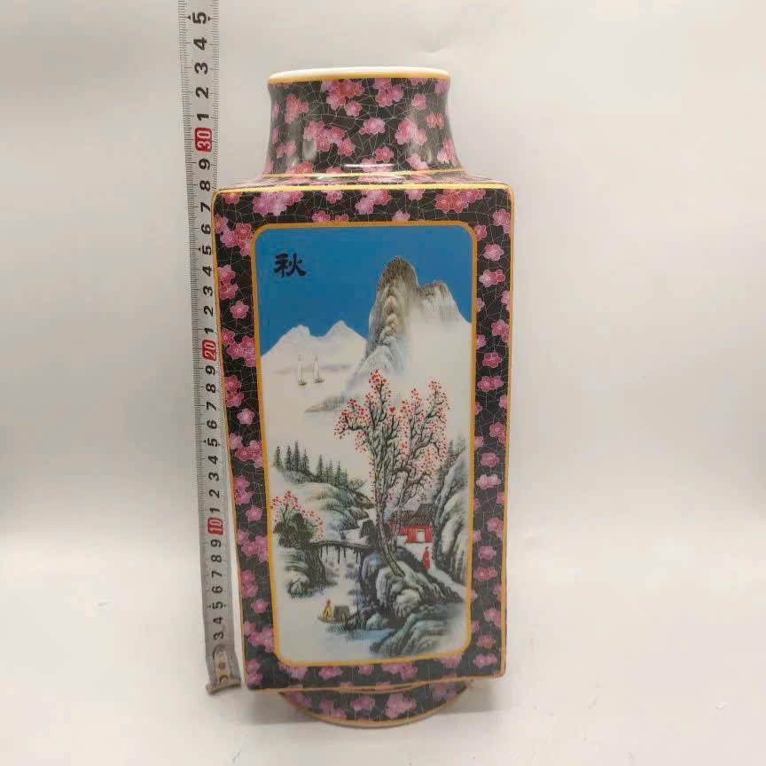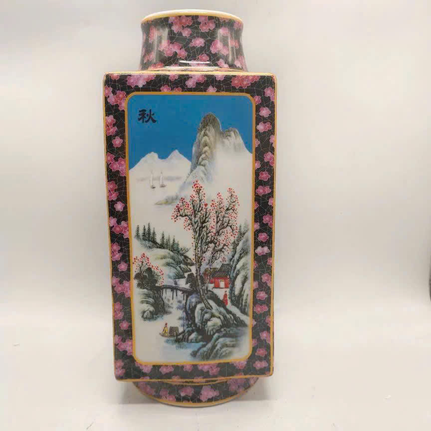 Bình có bốn mặt, mỗi mặt có một khung vẽ viền vàng. Viền ngoài của bình có nền đen với họa tiết hoa anh đào màu hồng. Bức tranh mô tả những ngọn núi phủ tuyết, cây cối trụi lá, và một ngôi nhà nhỏ với hai nhân vật nhỏ đang đi trên con đường phủ tuyết. Chữ Hán màu xanh ở góc trên bên trái của bức tranh có nghĩa là “mùa đông”. Phần cổ và đế bình cũng có họa tiết tương tự