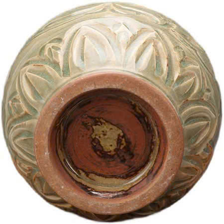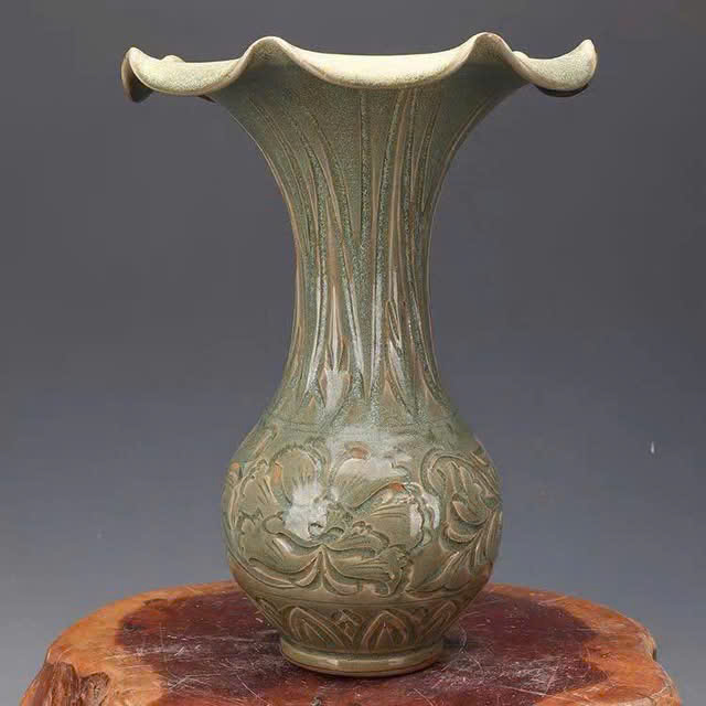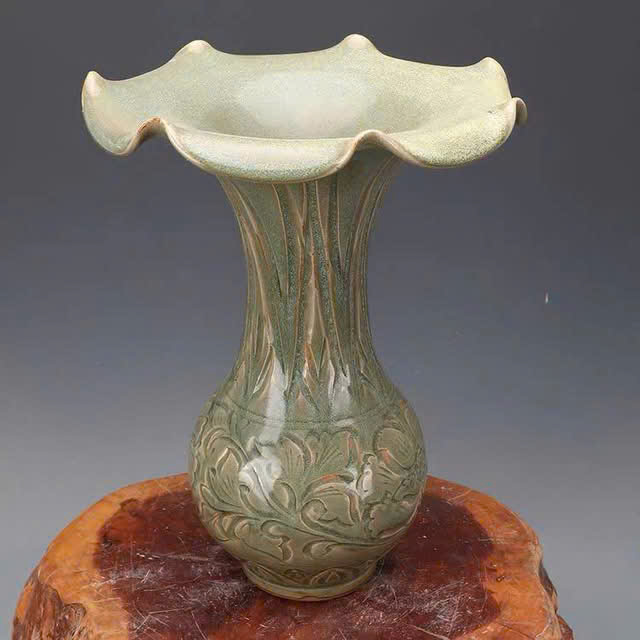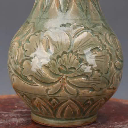 Đây là một chiếc bình gốm men ngọc (celadon glaze) với họa tiết được chạm khắc tinh xảo