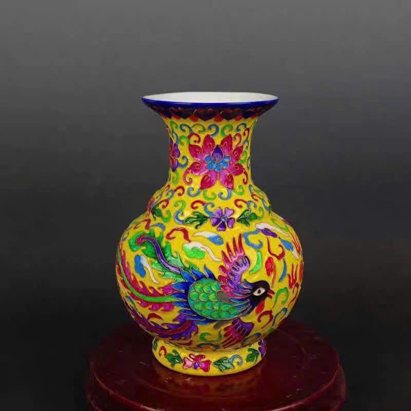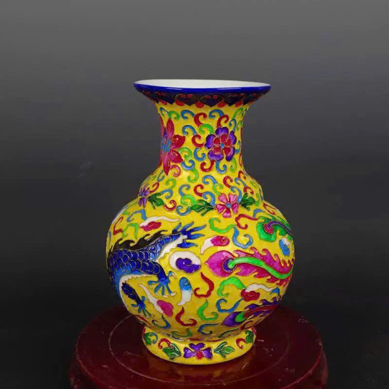 Chiếc bình được vẽ thủ công tỉ mỉ với các họa tiết hoa văn phức tạp, thể hiện kỹ thuật chế tác tinh xảo. Họa tiết rồng và hoa sen tượng trưng cho sức mạnh, quyền lực thần thánh, hòa bình, sự thuần khiết và may mắn. Men sứ chất lượng cao, với màu vàng chủ đạo rực rỡ và các chi tiết màu xanh lam, tím, hồng, xanh lá cây nổi bật