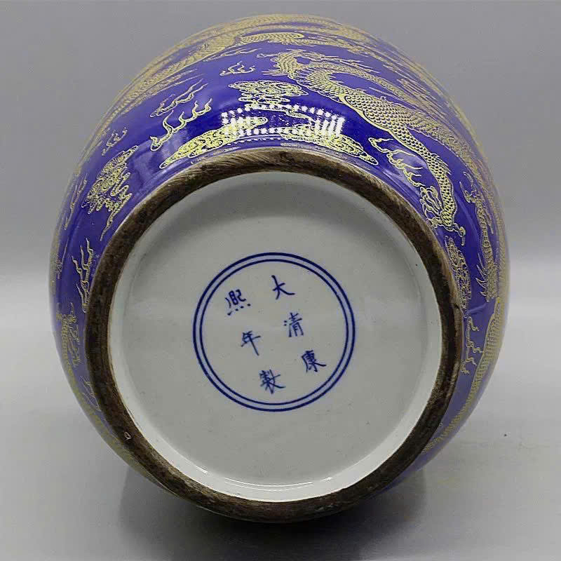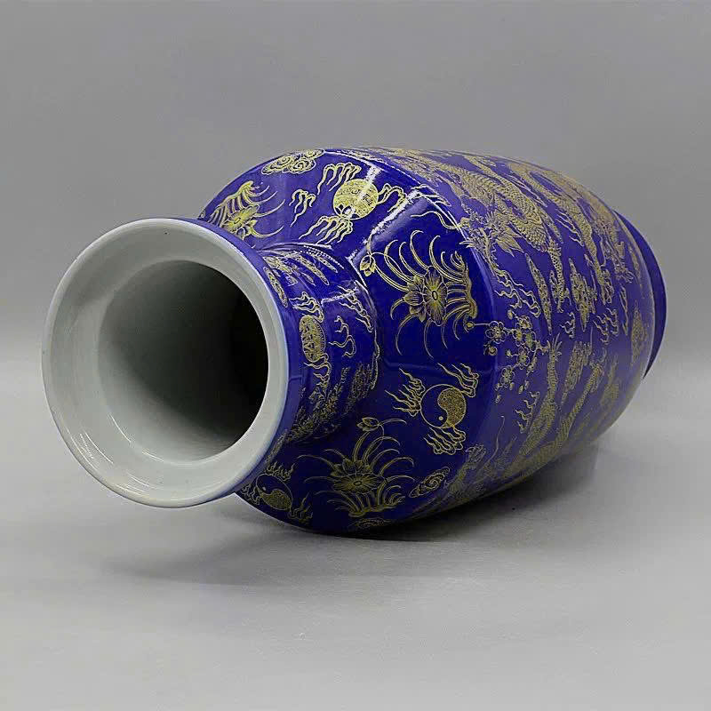 Màu men xanh coban đậm làm nền cho các họa tiết rồng và mây mạ vàng. Hoa văn được vẽ thủ công, chi tiết và sắc nét.