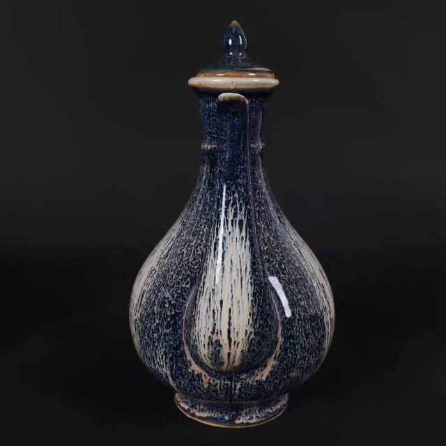 - Bình làm từ gốm sứ và được phủ lớp men lam đậm, có hiệu ứng “hỏa biến” (flambé glaze) hay “men chảy”.