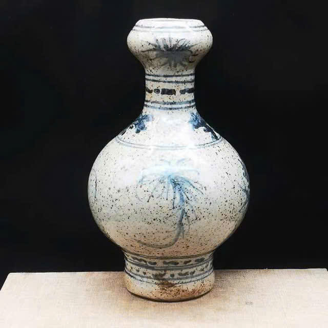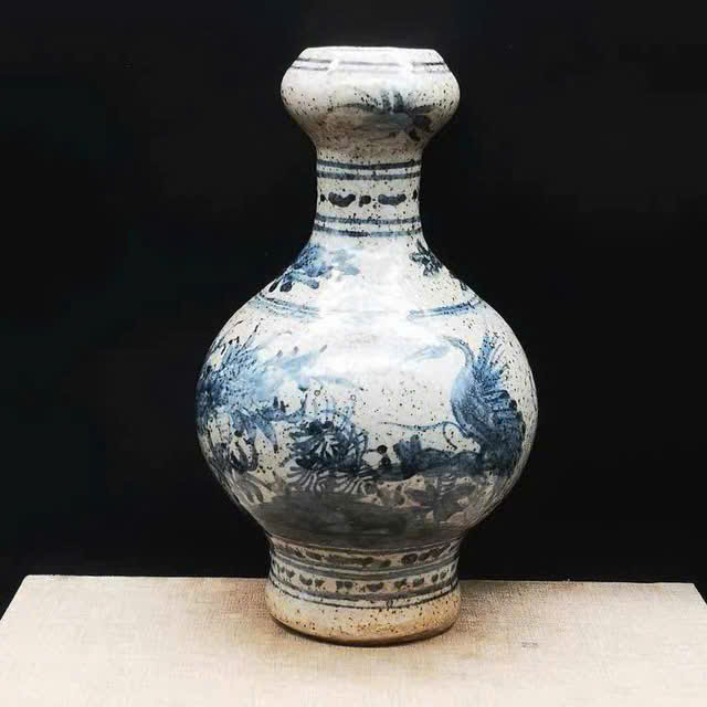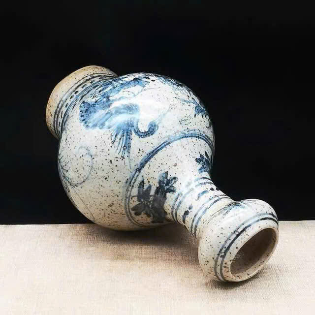 - Chất liệu và màu sắc: Bình được làm từ gốm sứ, nổi bật với men trắng và các họa tiết vẽ tay màu xanh coban (men lam) dưới men. Màu xanh có các sắc thái đậm nhạt khác nhau, tạo nên hiệu ứng thủy mặc. Bề mặt bình có thể có các vết rạn men (crackle glaze) giả cổ, làm tăng thêm vẻ ngoài cổ kính.