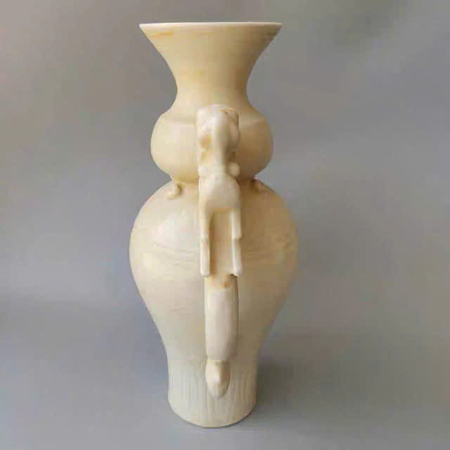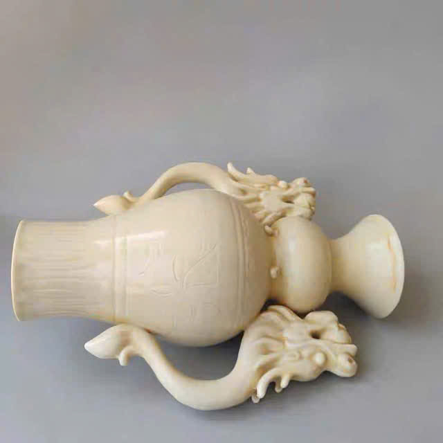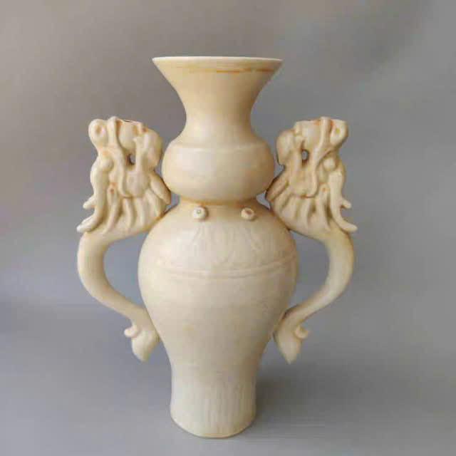 Chiếc bình trong hình là một bình sứ Trung Quốc men trắng ngà (cream glaze) với hai quai cầm hình rồng, được chế tác theo phong cách mô phỏng đồ gốm cổ đại (archaistic style). Đây có thể là một sản phẩm gốm Đinh (Ding ware) nổi tiếng của Trung Quốc hoặc gốm men trắng thời Lý-Trần của Việt Nam do có nhiều nét tương đồng về màu men và kiểu dáng.