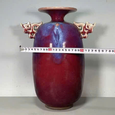 bình gốm sứ Trung Quốc tráng men “flambé” (men biến thiên), nổi tiếng với sự pha trộn màu sắc tự nhiên giữa đỏ và tím.
