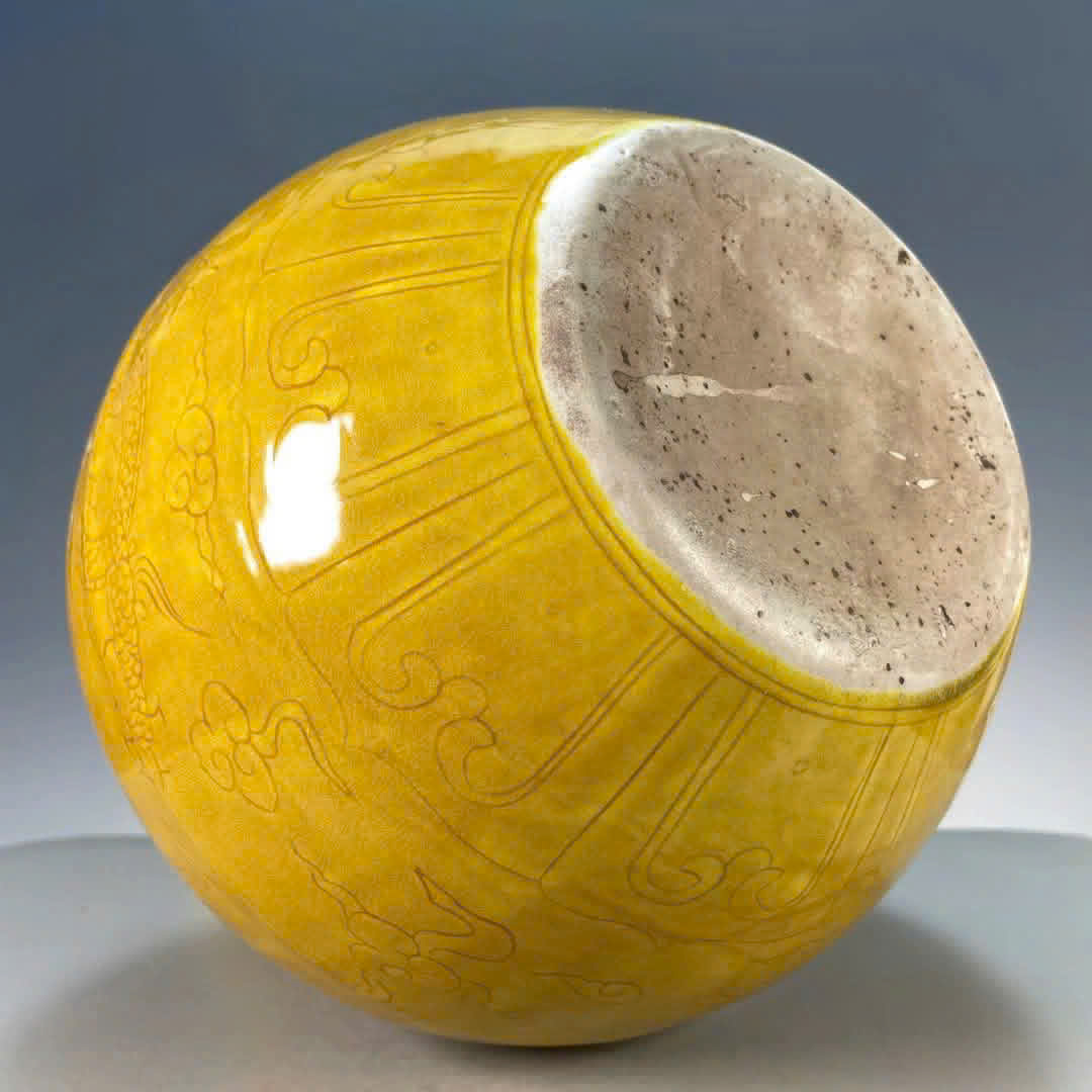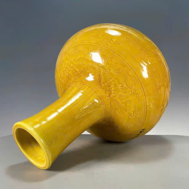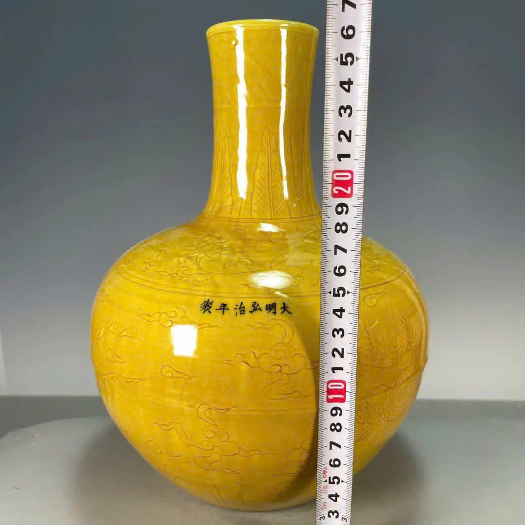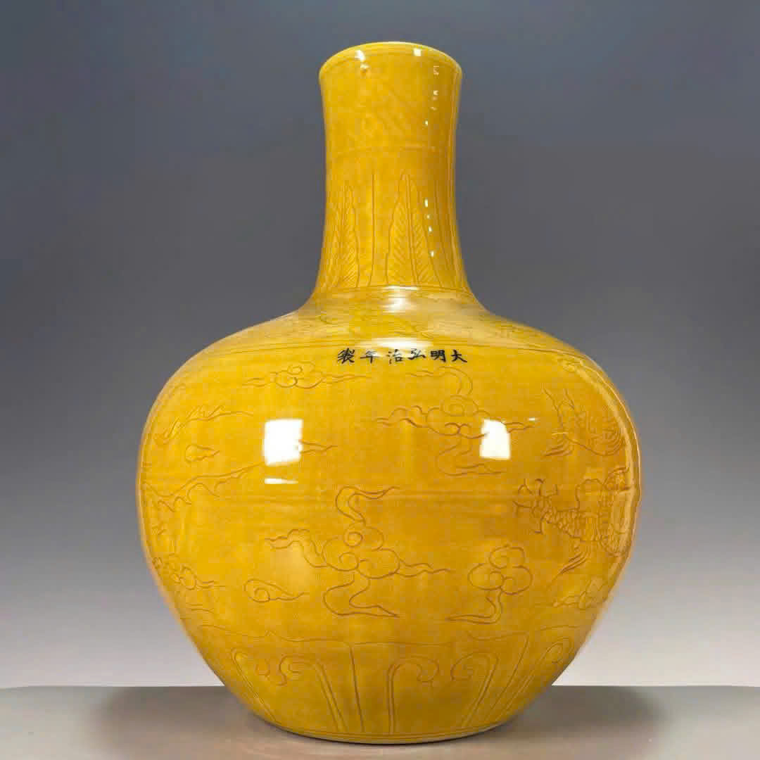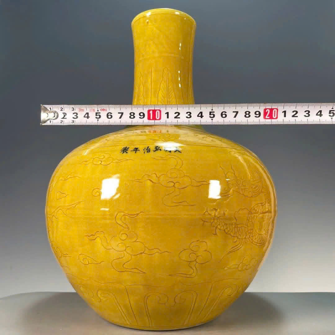 Chất liệu: Gốm sứ tráng men vàng hoàng gia (Imperial yellow glaze). Triều đại: Dấu triện trên bình cho thấy nó có niên đại từ thời nhà Minh, niên hiệu Hoằng Trị (1488-1505). Hoa văn: Bình được chạm khắc chìm hoa văn rồng bay trong mây (dựa trên các mô tả sản phẩm tương tự). Hình dáng: Dáng bình cổ cao, thân phình tròn.