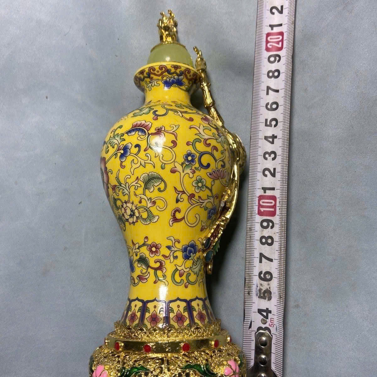 Màu sắc: Chủ đạo là màu vàng với các họa tiết hoa lá nhiều màu sắc (hồng, xanh dương, xanh lá cây). Đặc điểm: Phần nắp có hình tượng linh vật màu vàng, có thể là rồng hoặc kỳ lân, và phần đế cũng được trang trí công phu.