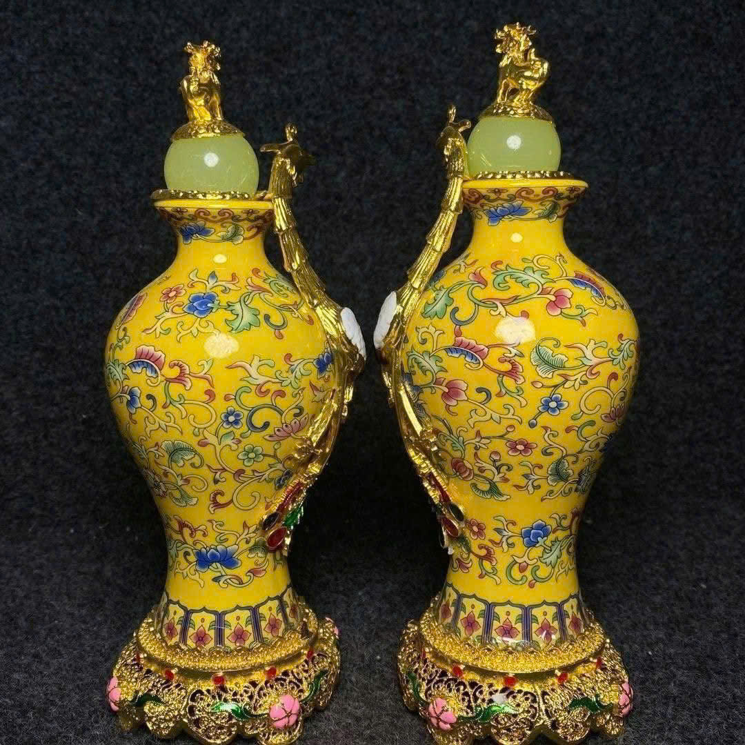 Cặp bình gốm bọc đồng hoạ tiết chi.m cô.ng.