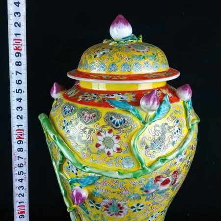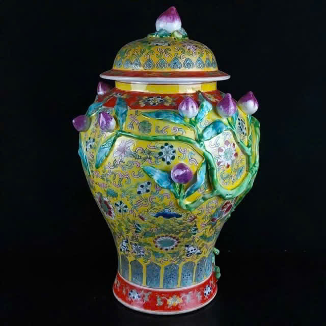 gốm sứ Trung Quốc có nắp, nổi bật với lớp men màu vàng hoàng gia, thường được tìm thấy ở dòng đồ sứ cao cấp thời nhà Thanh.