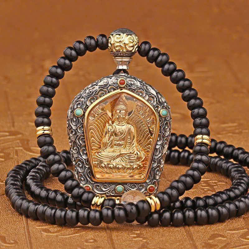 Chất liệu: Phần mặt dây chuyền có khung màu bạc (thường là bạc Thái S925 ), bên trong có tượng Phật mạ vàng 24K hoặc đồng mạ vàng. Vòng cổ làm bằng chuỗi hạt màu đen, có thể là đá phong thủy hoặc gỗ, điểm xuyết các hạt màu vàng và các hạt đá nhỏ màu đỏ, xanh ngọc.