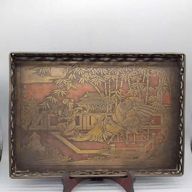 Chiếc khay này là một vật phẩm nghệ thuật bằng đồng, thường được biết đến với tên gọi Đĩa trà Đồng Pha Ái Trúc