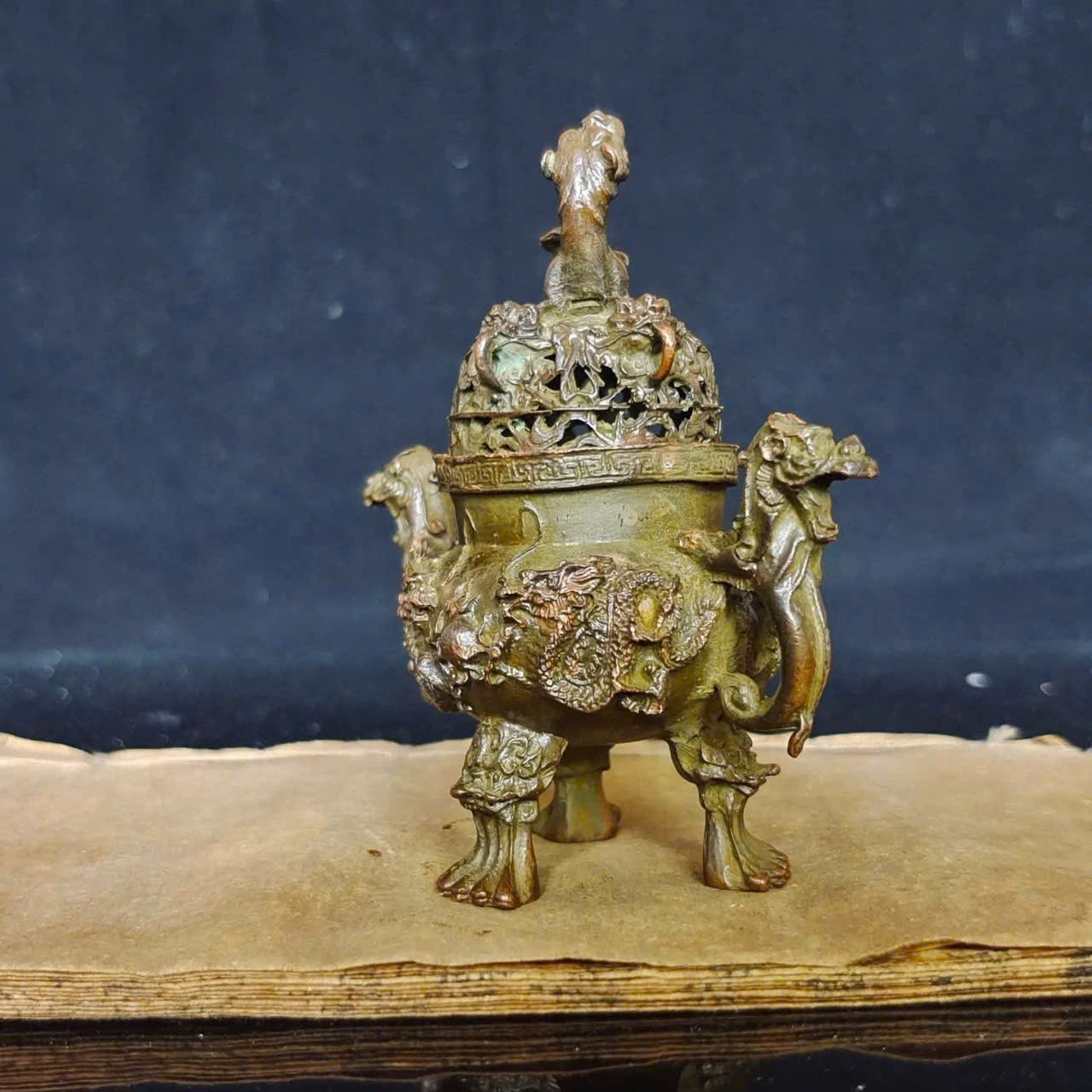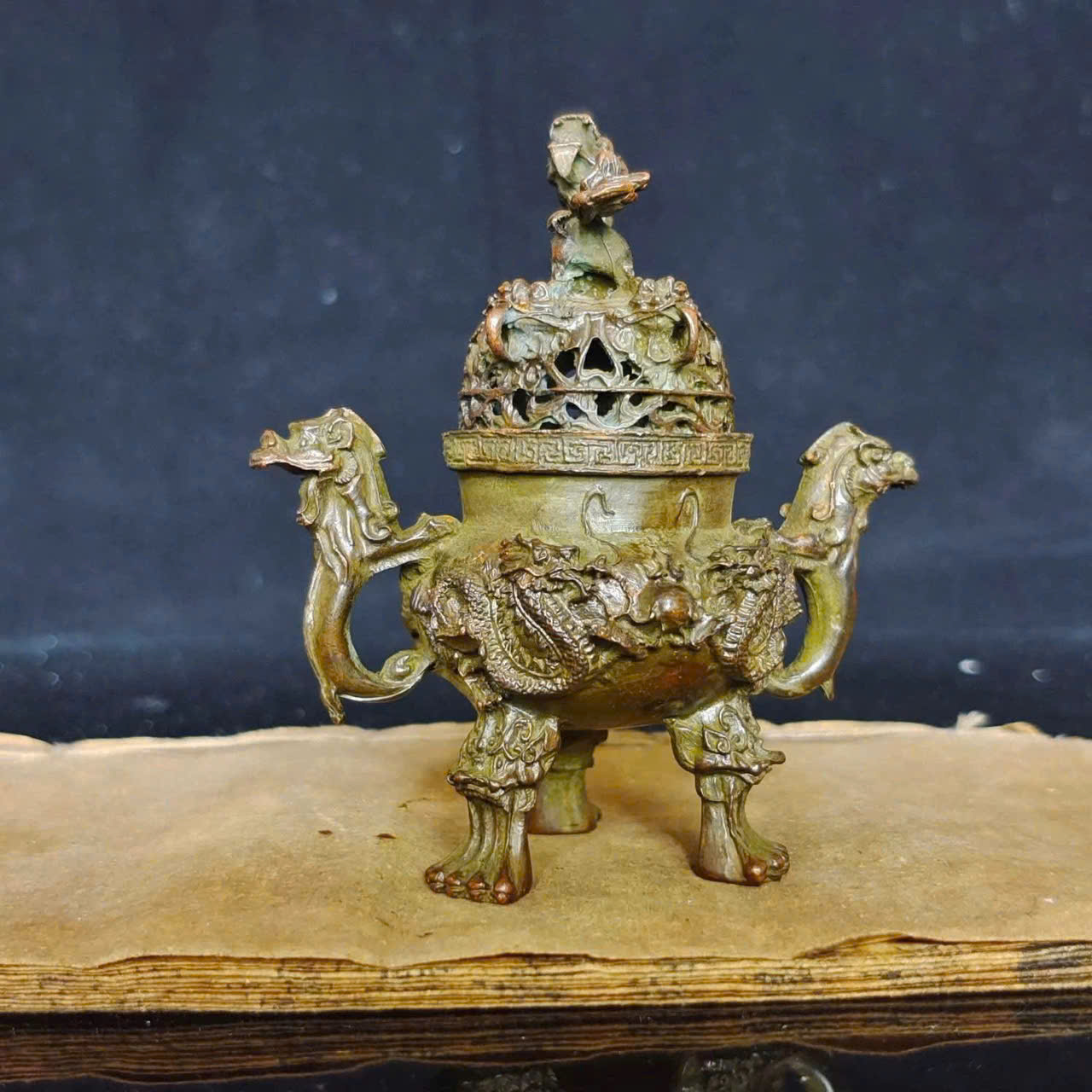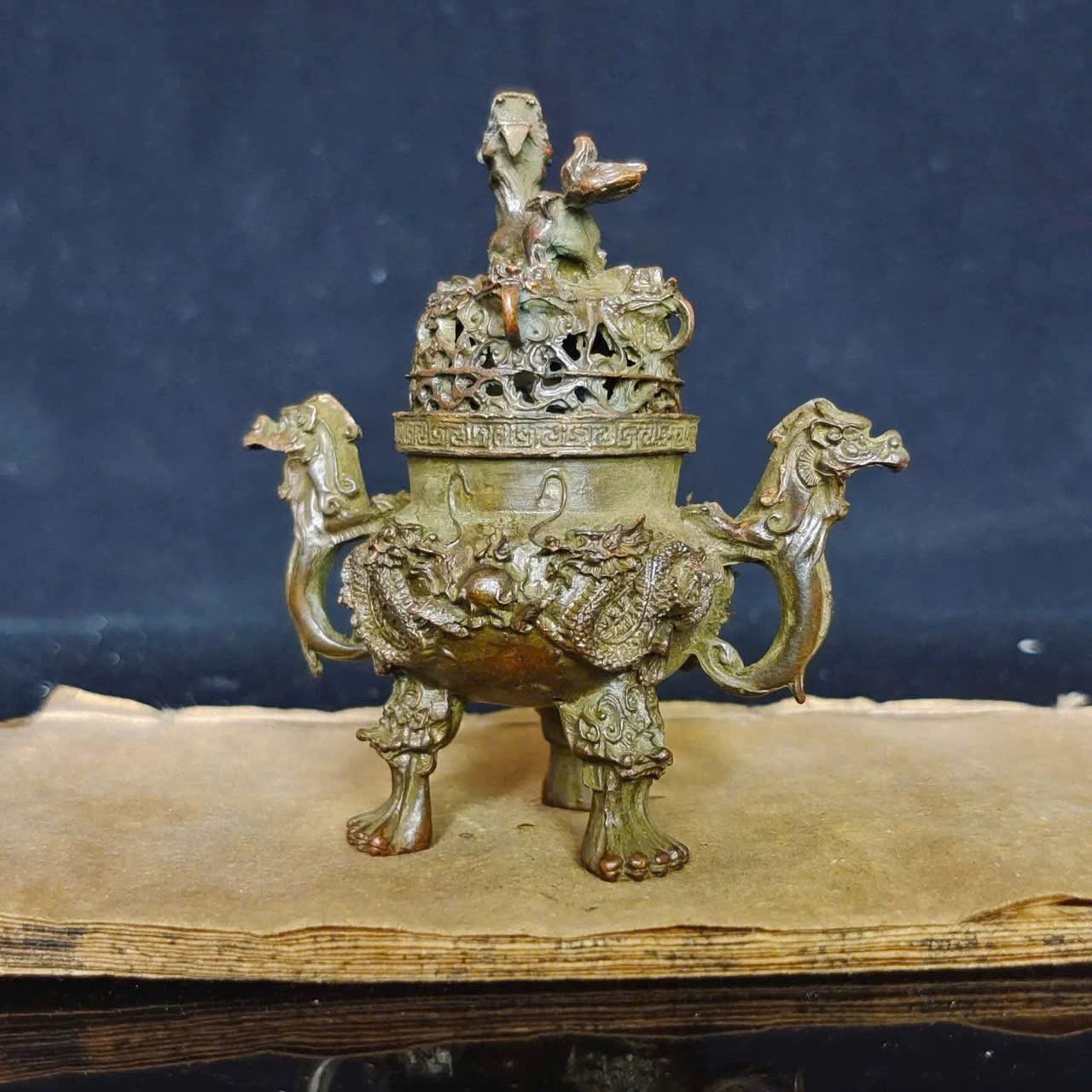 Đỉnh đồng cũ Song Long Hý Châu có tác dụng chính là vật phẩm thờ cúng, dùng để đốt trầm hương, thể hiện lòng thành kính với tổ tiên, cầu mong bình an, may mắn và tài lộc; đồng thời, họa tiết Song Long Hý Châu (Rồng chơi ngọc/Mặt trăng) mang ý nghĩa cầu cho sự thịnh vượng, uy quyền và gắn kết gia đình, giúp xua đuổi tà khí, tăng vượng khí, tạo sự trang nghiêm, thanh tịnh cho không gian thờ cúng.