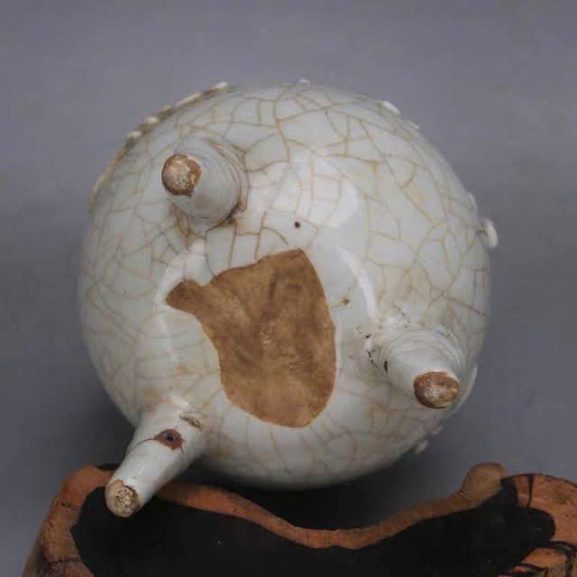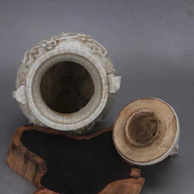 • Chất liệu và Men gốm: Đỉnh hương được làm từ sứ và phủ một lớp men rạn trắng ngà dày. Đặc điểm nổi bật là các vết rạn nứt (crazing) tự nhiên trên bề mặt men, tạo nên vẻ đẹp cổ kính và độc đáo. Phần đáy và các chân không tráng men, để lộ xương gốm.