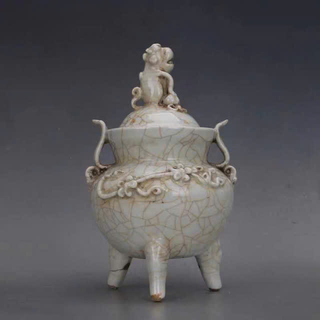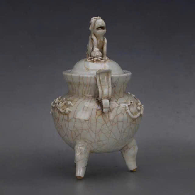 Đây là đỉnh hương gốm sứ men rạn trắng có ba chân và nắp hình sư tử, được chế tác theo phong cách đồ gốm cổ Trung Quốc, cụ thể là từ lò Quan Diêu (Song Guan Kiln).
