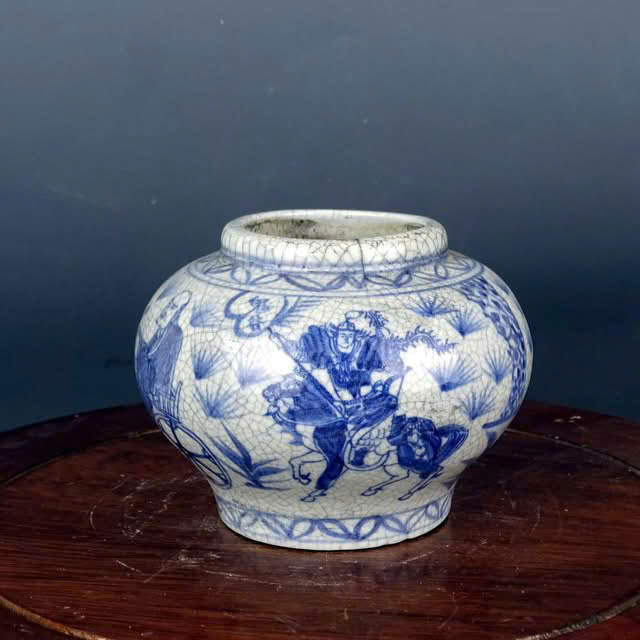 hũ gốm sứ men rạn (crackle glaze) vẽ hoa lam, mô tả cảnh nhân vật cưỡi ngựa trong một câu chuyện cổ tích Á Đông.