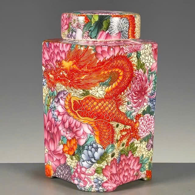 Loại sản phẩm: Hũ/Hộp đựng trà (tea caddy). Chất liệu: Sản phẩm hiển thị trên màn hình có khả năng cao là gốm hoặc sứ, dựa trên bối cảnh cửa hàng “Mỹ Nghệ” Việt Nam. Họa tiết: Nổi bật với hình ảnh rồng vàng/đỏ được vẽ hoặc đắp nổi tinh xảo, xung quanh là hoa văn hoa cúc hoặc các loại hoa khác với nhiều màu sắc rực rỡ (vạn hoa). Công dụng: Dùng để bảo quản trà, giữ hương vị trà lâu dài, hoặc làm đồ trang trí sang trọng