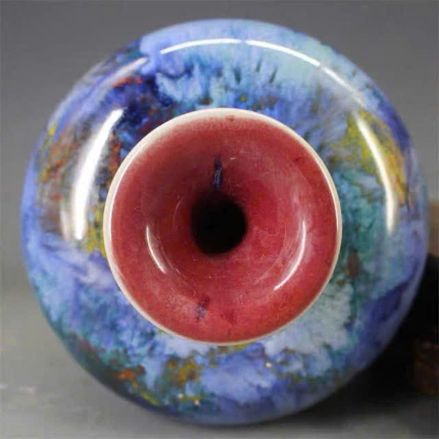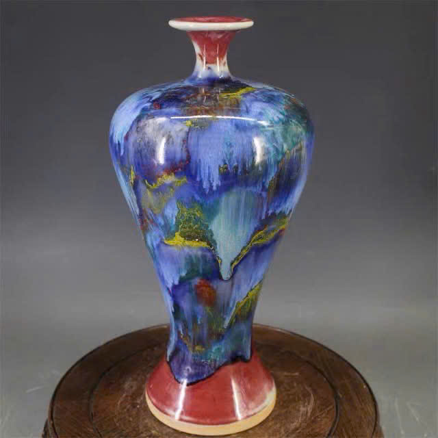 - Chất liệu và Men: Bình làm từ gốm hoặc sứ, nổi bật với kỹ thuật tráng men “flambé” (men chảy hoặc men biến) phức tạp. Các màu men xanh lam, xanh ngọc, vàng và đỏ mận hòa quyện và chảy loang tự nhiên trên bề mặt, tạo nên hiệu ứng thị giác độc đáo, gợi nhớ đến cảnh quan thiên nhiên như núi non và sông nước. Lớp men dày và bóng.
