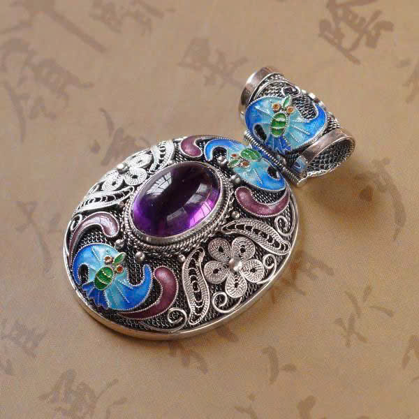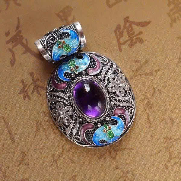 Tâm mặt dây là một viên đá cabochon màu tím đậm, có độ bóng cao, nhìn như thạch anh tím (amethyst).