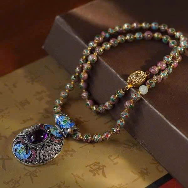 • Trên phần thân và khoen treo có các mảng tráng men cloisonné với sắc xanh lam – xanh lục – vàng, tạo hình giống như những sinh vật huyền thoại hoặc họa tiết cánh cách điệu.