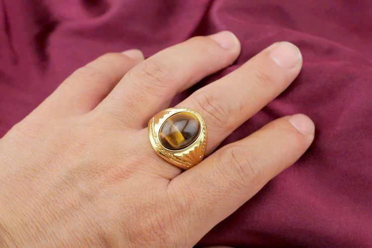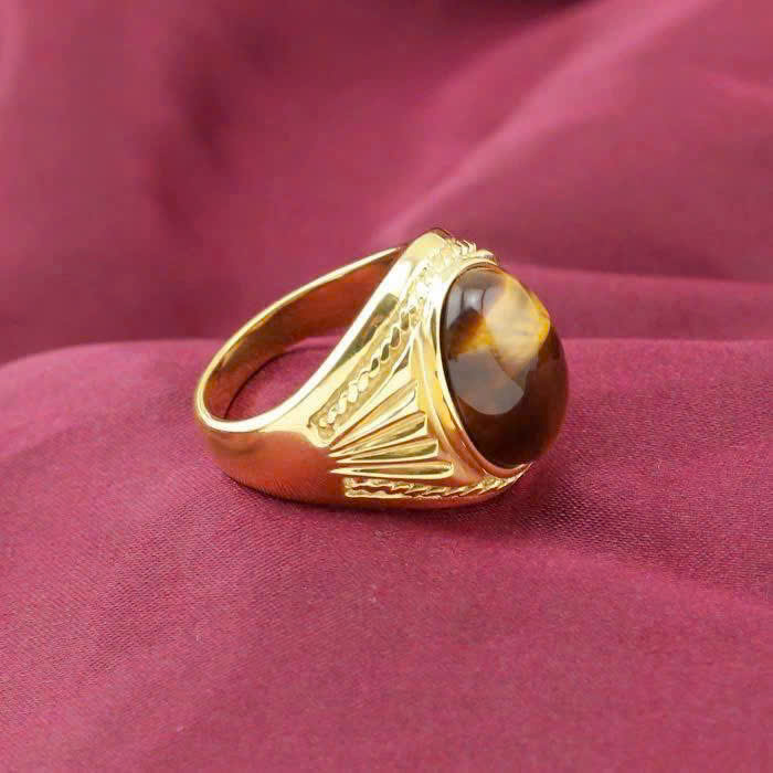 hiếc nhẫn trong ảnh là một nhẫn nam bằng vàng với thiết kế mạnh mẽ và sang trọng. • Chất liệu: vàng vàng, có độ bóng cao, thể hiện sự đẳng cấp và quý phái. • Kiểu dáng: bản to, thân nhẫn dày, được chạm khắc hoa văn nhẹ hai bên viền để tạo điểm nhấn tinh tế. • Đá chủ: là một viên mắt hổ (Tiger’s Eye) hình oval, được mài bóng. Viên đá có hiệu ứng ánh sáng đặc trưng như dải lụa vàng nâu chạy dọc, tạo cảm giác sống động khi nhìn ở các góc khác nhau. • Phong cách tổng thể: mang hơi hướng cổ điển, thể hiện sự mạnh mẽ, tự tin và quyền lực – rất phù hợp với phái mạnh.