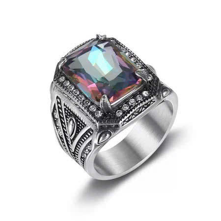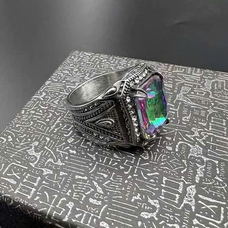 - Đá quý: Viên đá trung tâm hình chữ nhật, thường là đá Mystic Topaz (Topaz huyền bí) hoặc cubic zirconia đa sắc, có hiệu ứng đổi màu cầu vồng khi nhìn ở các góc độ khác nhau. Đá được cắt kiểu emerald cut và đính chắc chắn bằng bốn chấu lớn.