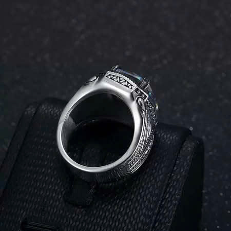 - Thiết kế: Nhẫn mang phong cách cổ điển, hầm hố (biker style). Các vai nhẫn được chạm khắc các họa tiết phức tạp, có thể là hình rồng hoặc vân xoắn, tạo nên vẻ ngoài quyền lực và cá tính. Phần kim loại xung quanh viên đá còn được nạm các hạt đá nhỏ lấp lánh (micro-pave setting).