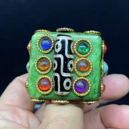 - Khảm Dzi Bead: Mặt chính giữa của nhẫn được khảm một mảnh hạt Dzi Bead (Thiên châu) với họa tiết hình học màu đen trắng, có thể là họa tiết “mắt” hoặc các ký hiệu tôn giáo, được bao quanh bởi khung kim loại chạm khắc.