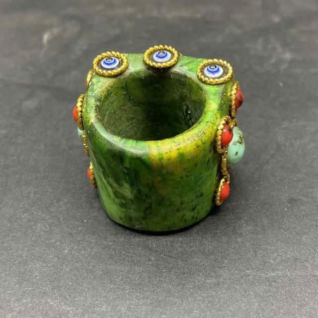 - Chất liệu và Hình dáng: Nhẫn có hình dáng khối vuông hoặc chữ nhật, làm từ ngọc bích tự nhiên có vân. Đây là loại nhẫn truyền thống ban đầu dùng để bảo vệ ngón tay cái khi bắn cung, sau này phát triển thành món đồ trang sức và sưu tầm.