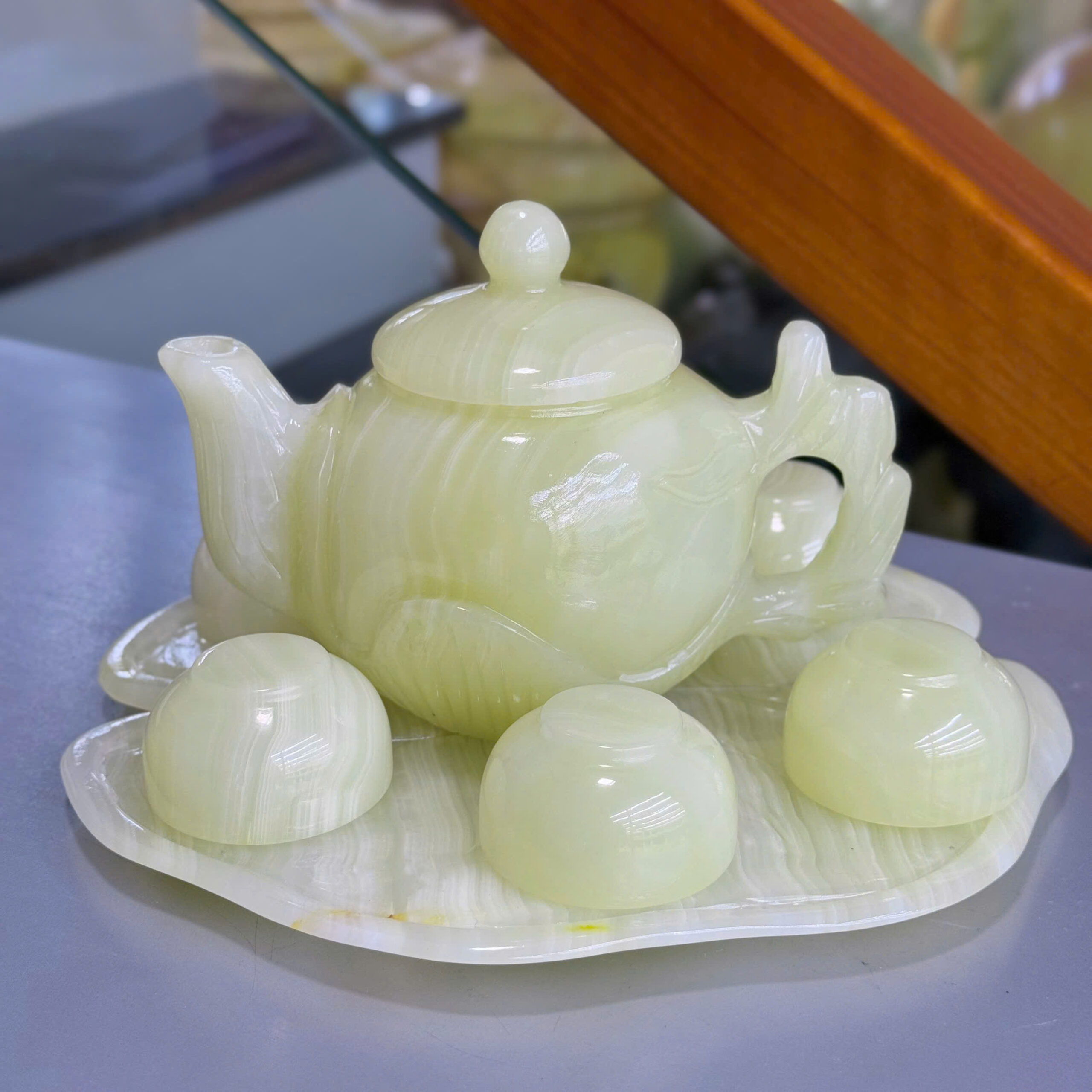 Tách trà chạm lá sen lớn đá ngọc Onyx xanh kết hợp ý nghĩa phong thủy (may mắn, tài lộc, sức khỏe, cân bằng cảm xúc) với công dụng thực tế (giữ nhiệt, làm trà đậm đà) và giá trị thẩm mỹ (sang trọng), tạo không gian thưởng trà thư thái, kết nối, tốt cho tinh thần và sức khỏe, đồng thời kích hoạt năng lượng tích cực.