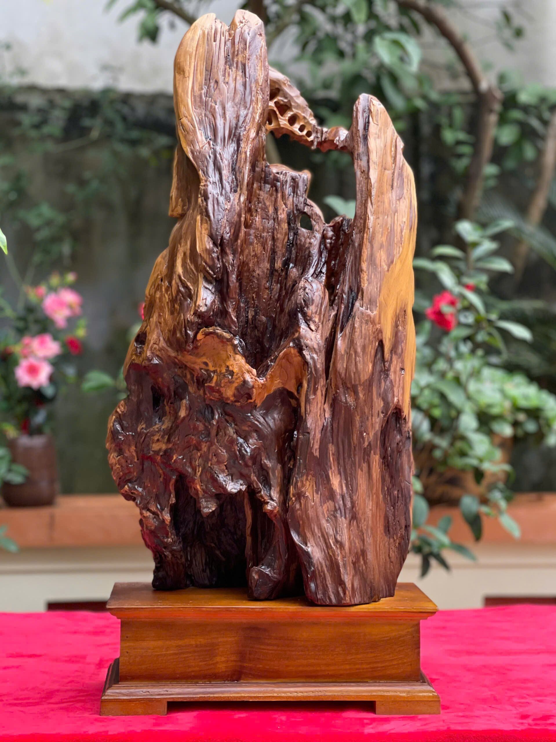 tác phẩm gỗ bách xanh Mộc Châu, hương thơm thanh nhẹ – vân gỗ nổi sang trọng, tượng khắc sắc nét mang ý nghĩa chiêu tài đón lộc