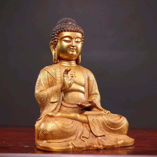 - Chất liệu và hoa văn: Tượng có màu vàng đồng, bề mặt được chạm khắc các hoa văn tinh xảo trên áo cà sa và đài sen.