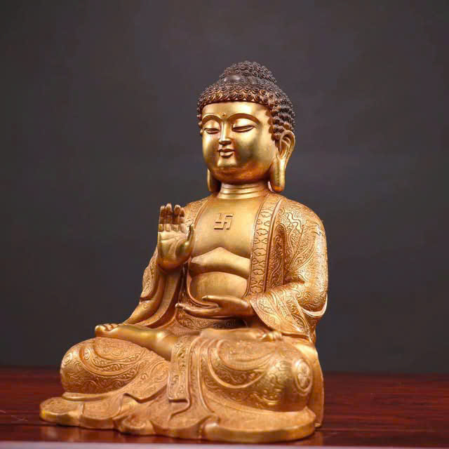 - Thủ ấn (Tư thế tay): Tay phải của Phật giơ lên ngang ngực, lòng bàn tay hướng ra ngoài và các ngón tay hướng lên trên, thể hiện ấn Vô úy (Abhaya Mudra), tượng trưng cho sự trấn an, xua tan sợ hãi. Tay trái đặt trong lòng, thể hiện sự thiền định hoặc tùy nguyện.