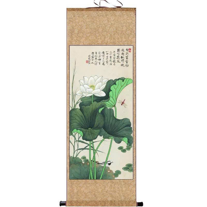 Phong cách: Tranh thủy mặc truyền thống, phối màu nhẹ nhàng, tinh tế. • Chất liệu: In hoặc vẽ trên lụa cao cấp, viền gấm cổ điển, có thanh treo tiện dụng. • Kích thước: Dạng tranh cuộn (tranh treo dọc) – dễ trang trí ở phòng khách, phòng thiền, phòng đọc sách. • Ý nghĩa phong thủy: • Mang lại bình an, thanh lọc năng lượng, giúp không gian thêm hài hòa. • Hoa sen trắng tượng trưng cho tâm hồn trong sáng và trí tuệ minh mẫn. Bạn có muốn mình viết một đoạn mô tả bán hàng hoặc quảng cáo ngắn cho bức tranh này theo phong cách tinh tế – thu hút khách mua tranh trang trí không?