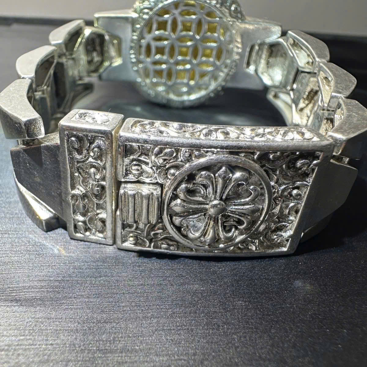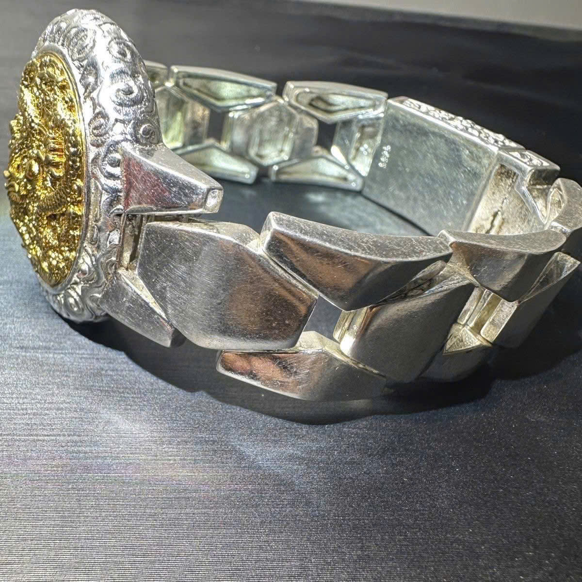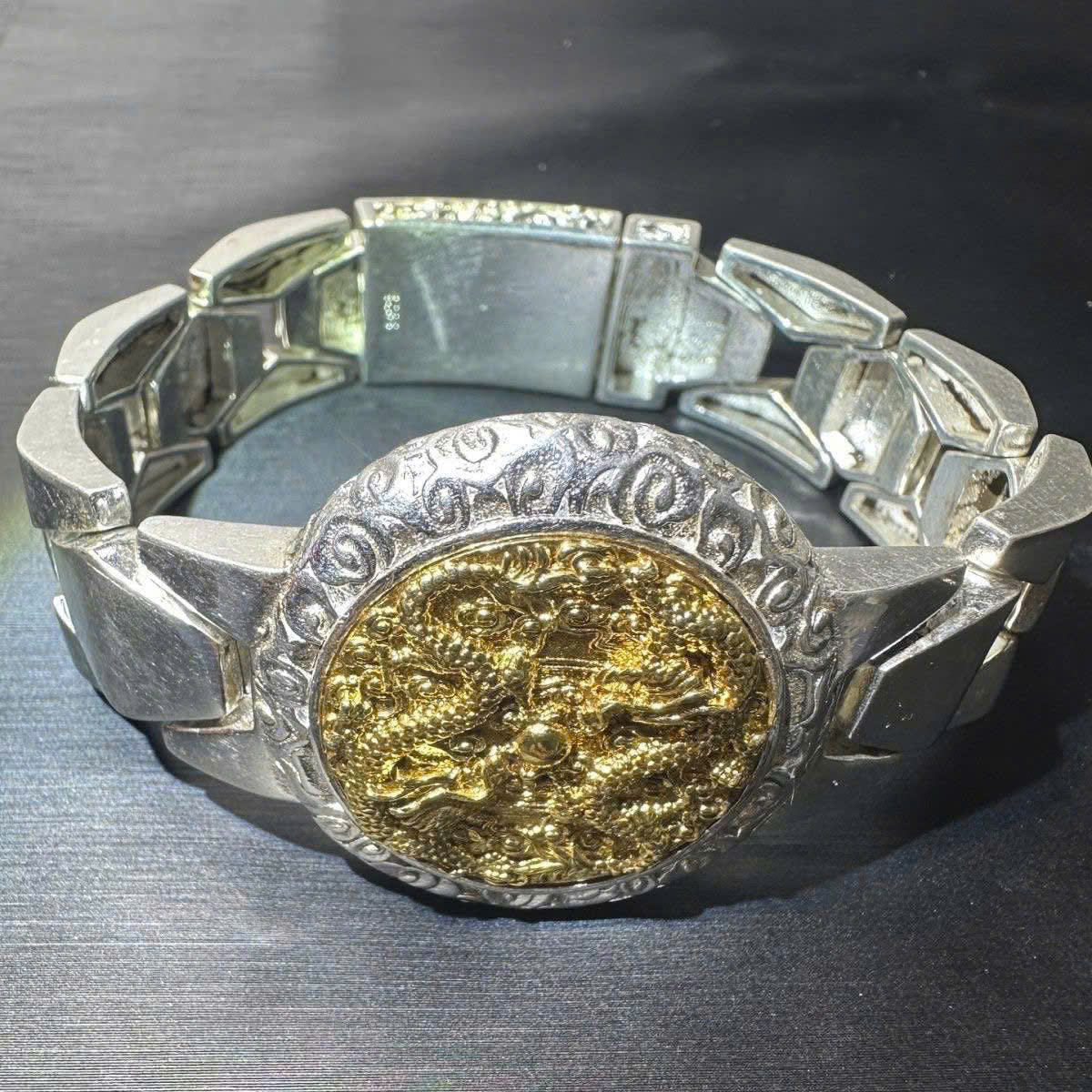 Vòng tay kim loại có mắt xích to, thiết kế mạnh mẽ, phần mặt trung tâm là đồng tiền/tròn nổi họa tiết rồng chạm nổi mạ vàng sáng bóng, viền hoa văn chạm khắc tinh xảo. Phần dây và khóa có tông bạc (trên khoá thấy dấu “925” ), tổng thể mang phong cách cổ, nam tính, phù hợp cả nam lẫn nữ thích đồ phong thủy/retro.